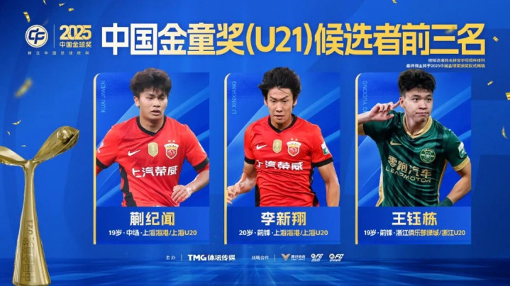 在2025中国金球奖的评比中,来自上海海港的蒋光太、上海申花的吴曦,入围候选者前三名。中国金童奖的强横竞争尤为引东说念主护理,上海海港的蒯纪闻、李新翔入围金童奖U21组别排行前三。此外,匡助上海海港再夺中超冠军的颜骏凌入围这次中国金手套奖评比的前三名。